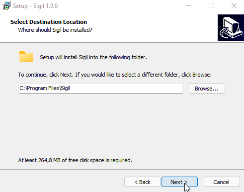 Una instalación como en cualquier otra que hayas hecho en Windows. Revisamos las licencia, aceptamos si estamos de acuerdo, y siguiente. La próxima ventana te mostrará los requisitos de espacio necesarios (264,8 MB) y la ruta donde quieras instalarlo. Puedes modificarla si quieres, aunque para evitar cualquier problema asociado a la configuración del software, a menos que sea necesario te recomendamos que dejes esa ruta con el valor por defecto: