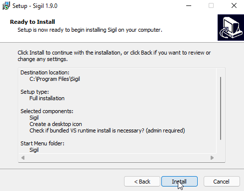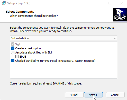 En la siguiente ventana del proceso, marcamos la instalación completa y no asociamos los ficheros ebook con Sigil, porque de esa forma ya nos va a utilizar esta aplicación por defecto para abrirlos y traería algo de trabajo revertir este cambio: