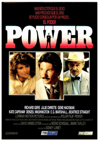 A diferencia de las anteriores la película Poder (Power, Sidney Lumet, 1986, 111 min.) rara vez es recordada. A la película le pesan los ochenterismos, personificados en Richard Gere, que de algún modo extiende su personaje de American Gigolo (Paul Schrader, 1980) al rol de un de consultor político que, como el gigolo, ofrece a sus clientes lo que quieren sin mayor compromiso o implicación. El mundo de los consultores políticos sin principios y de la política espectáculo son el objeto de la denuncia de Lumet, pero falta contundencia y sobran buenas intenciones. El casting que rodea a Gere, con Gene Hackman, Julie Christie, Denzel Washington, entre otros, no consigue hacer atractiva la trama de traiciones, corruptelas y algunos peligros. La película podría haber hecho un buen díptico sobre la sociedad espectáculo con Network, un mundo implacable (Sidney Lumet, 1976, 121 min.), pero se queda corta. Lástima.