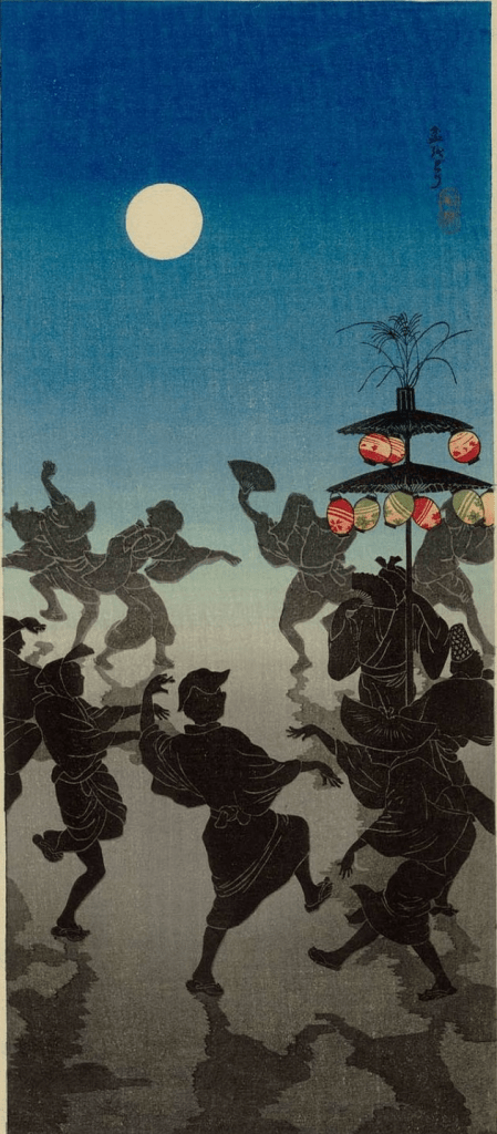 Este día, nos encontramos con un grabado de de Takahashi Hiroaki titulado: «Baile del festival de Obon (Bon Odori)». En dicho grabado podemos observar a varias personas, o quizá a sus sombras o la imagen de lo que fueron bailando bajo la luz de la luna llena en el festival de Obon.