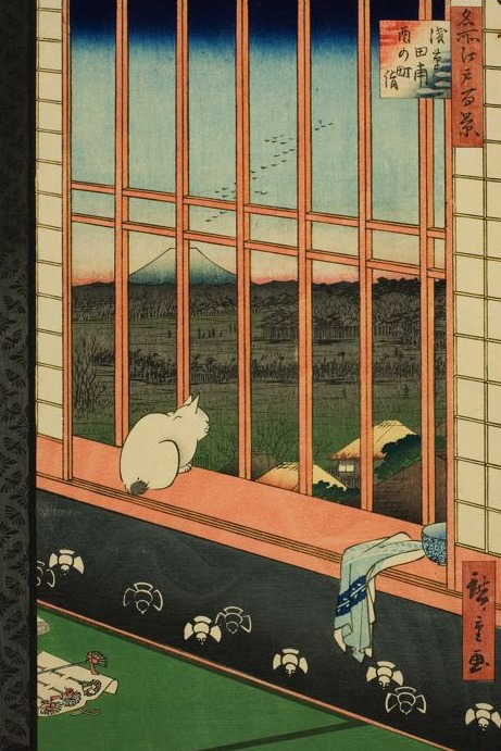 Este día, nos encontramos con un grabado de de Utagawa Hiroshige titulado: «Campo de arroz de Asakusa durante el Festival del Gallo en el Santuario de Otori». En él se puede observar a un gato contemplando por la ventana el ir y venir de labriegos así como viandantes y aves que migran. Y al fondo, como símbolo eterno de Japón: el Monte Fuji.