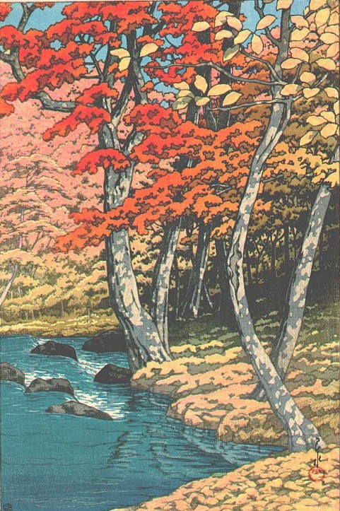 Hoy, a pesar de que el verano no quiere dar paso al otoño, no podemos evitar pensar en los colores de la estación del vuelo de las hojas. Por eso, os queríamos compartir un ukiyo-e de Kawase Hasui titulado: «Otoño en Oirase»